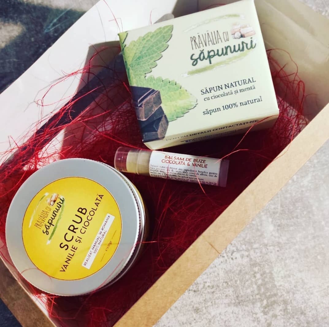 - Sapun natural cu ciocolata si menta 100gr – are un efect revigorant, răcorind pielea! Conţine o cantitate mare de antioxidanţi care au rolul de a proteja pielea de efectele nocive ale mediului (radicali liberi, praf, poluare etc.) şi are puternice efecte anti-îmbătrânire. Manufacturat din unturi și uleiuri naturale.